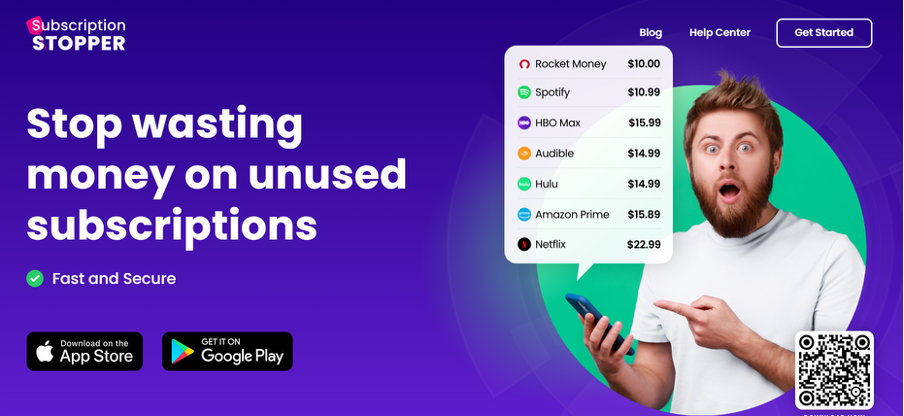 Subscription Stopper scans for recurring charges via Plaid and provides cancellation instructions (doesn't actually cancel for you). Privacy policy mentions data sharing with "third parties."