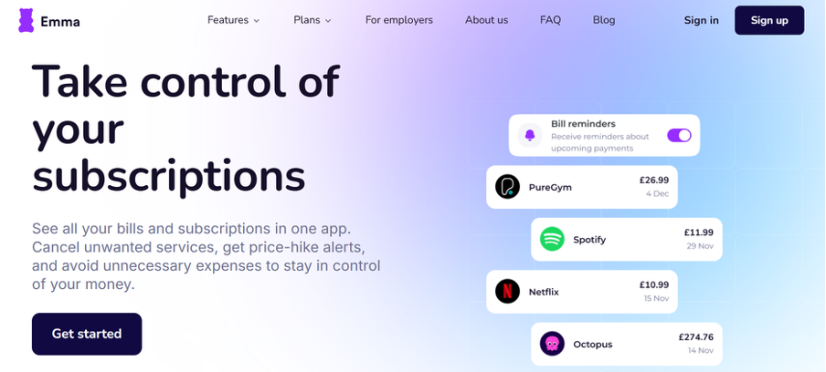Emma is a subscription tracker with beautiful design that connects all accounts (including crypto) into one dashboard. Shows subscriptions but doesn't help cancel them.